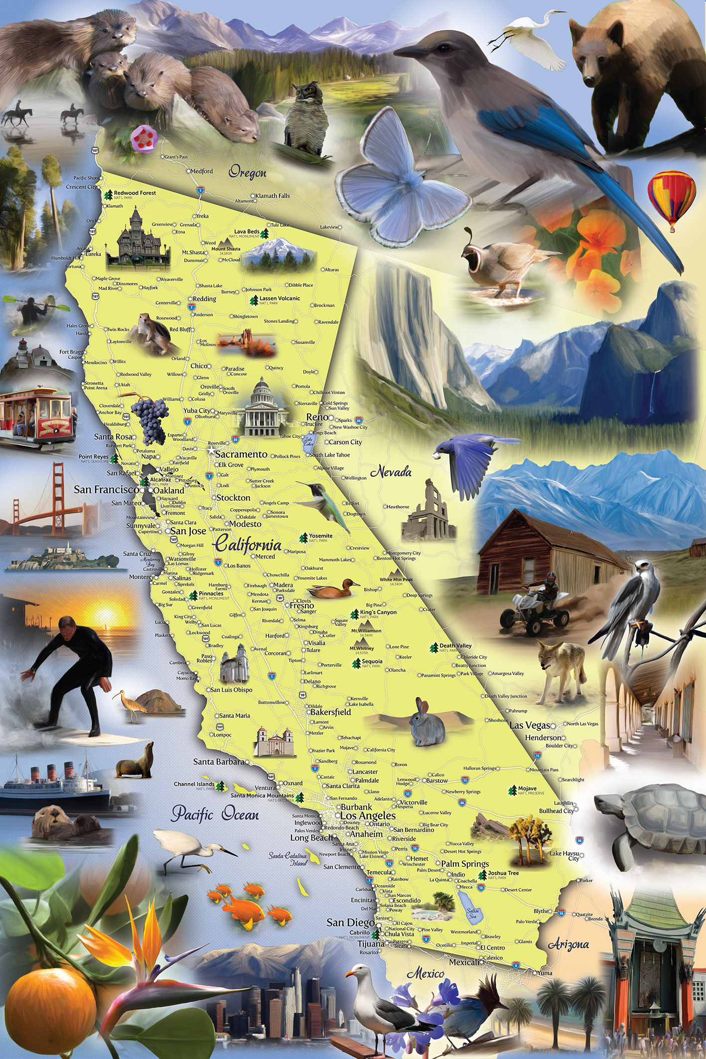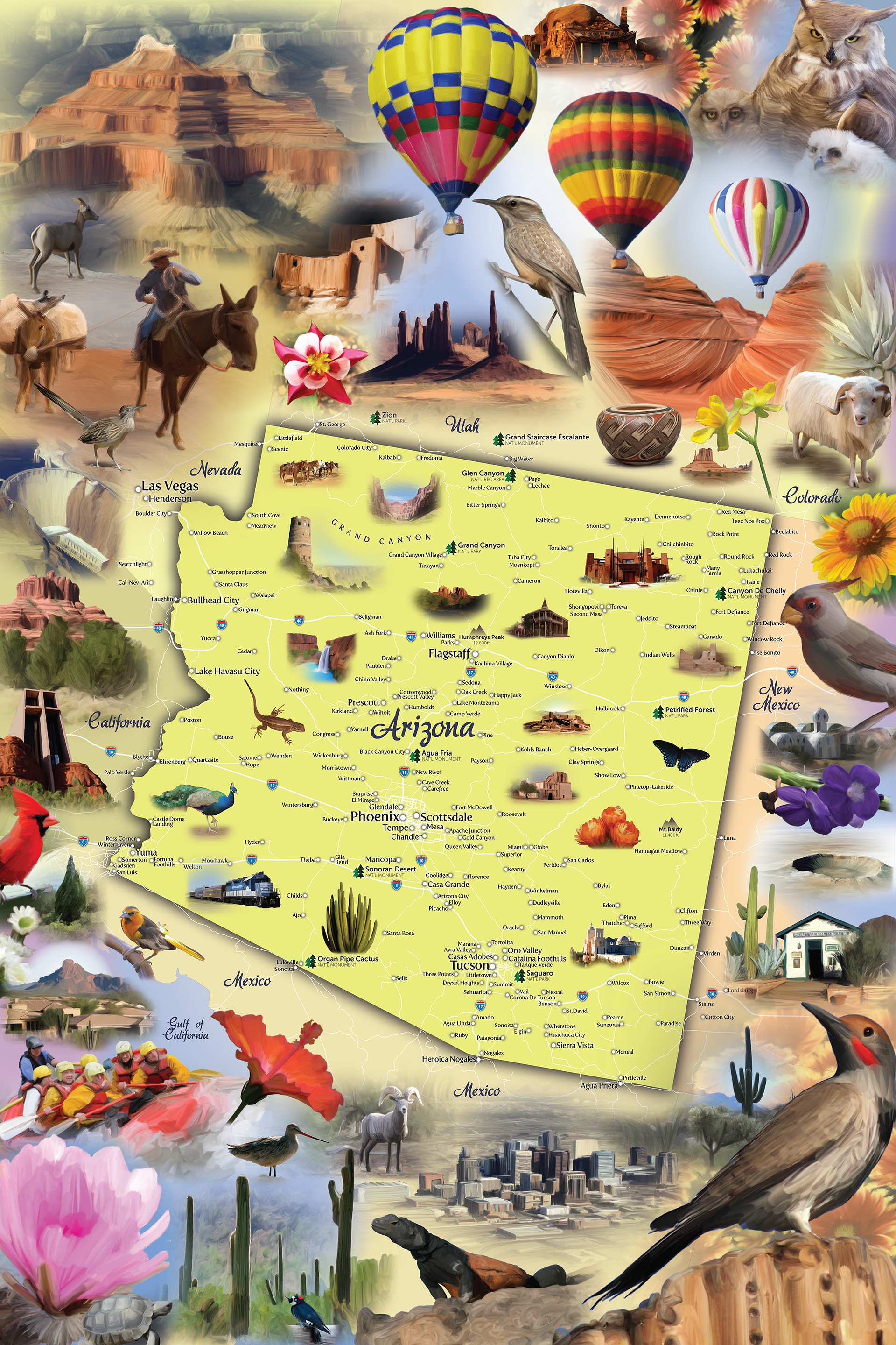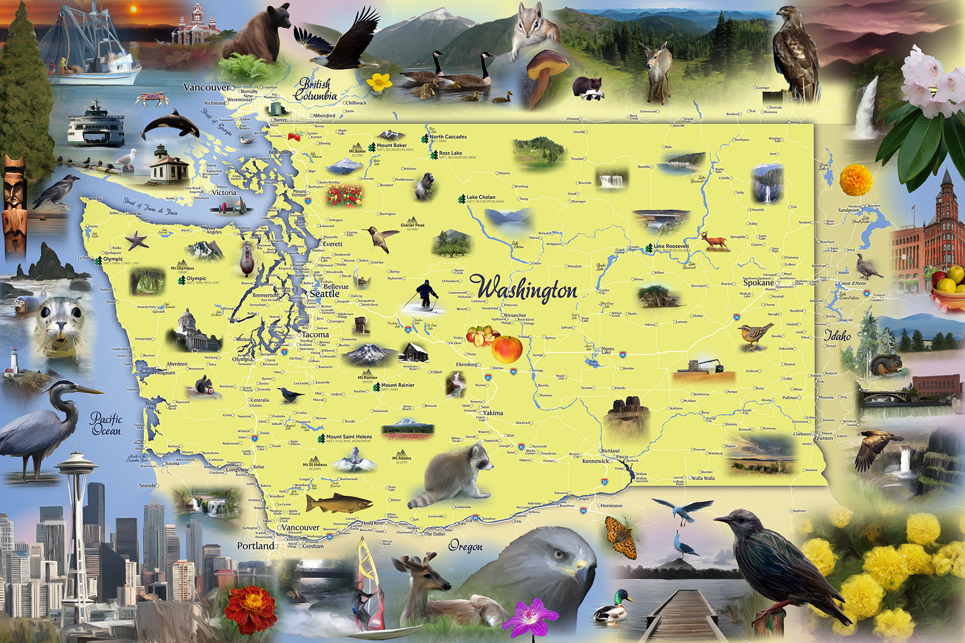 3 separate jigsaw puzzle maps created for Hennessy Puzzle Company by photo painting public domain images gathered on the internet, then cutting and collaging them together around each map.