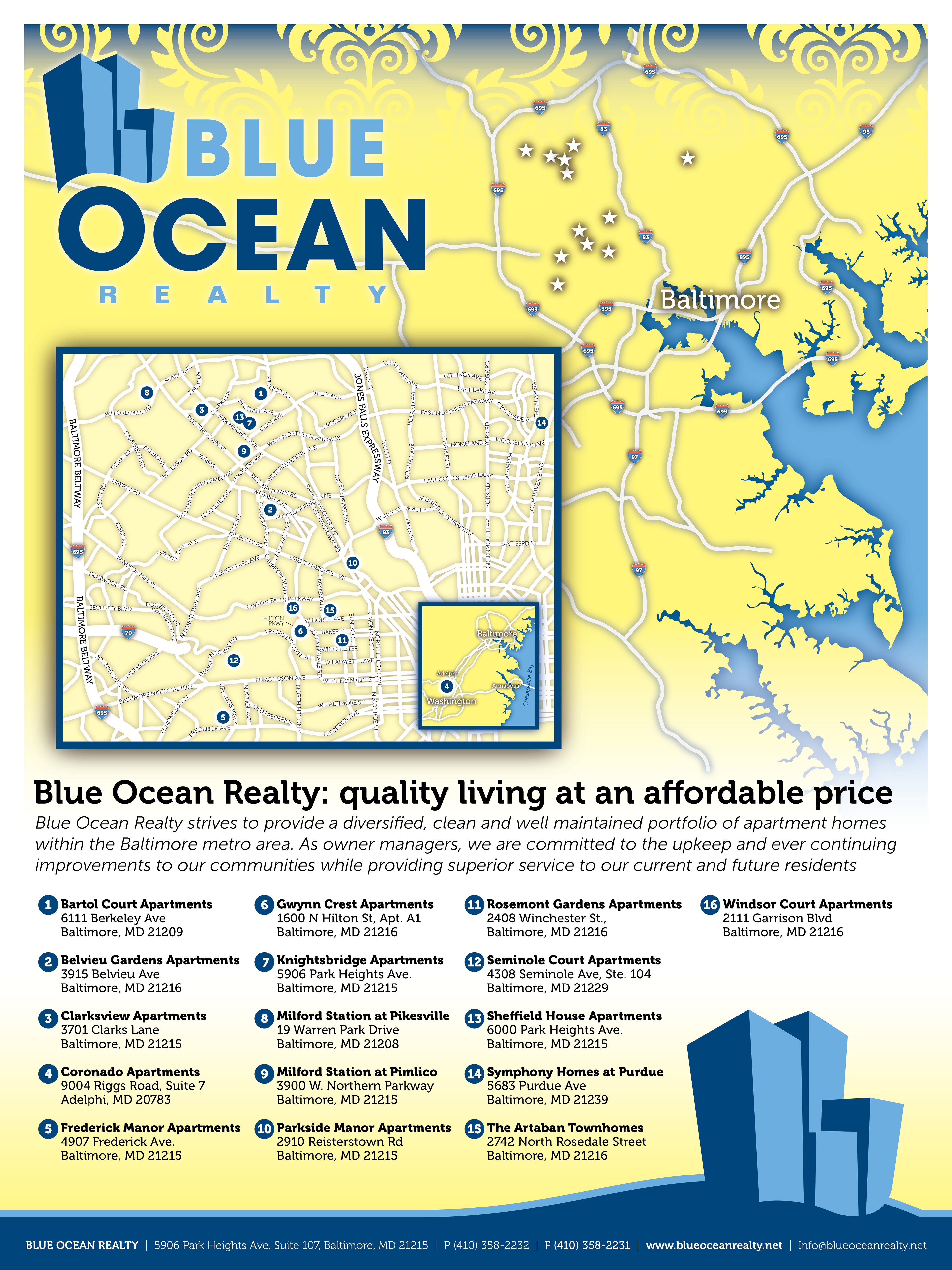 Map flier created for Blue Ocean Realty of Baltimore, Maryland showing properties offered for rent in the greater Chesapeake Bay region.