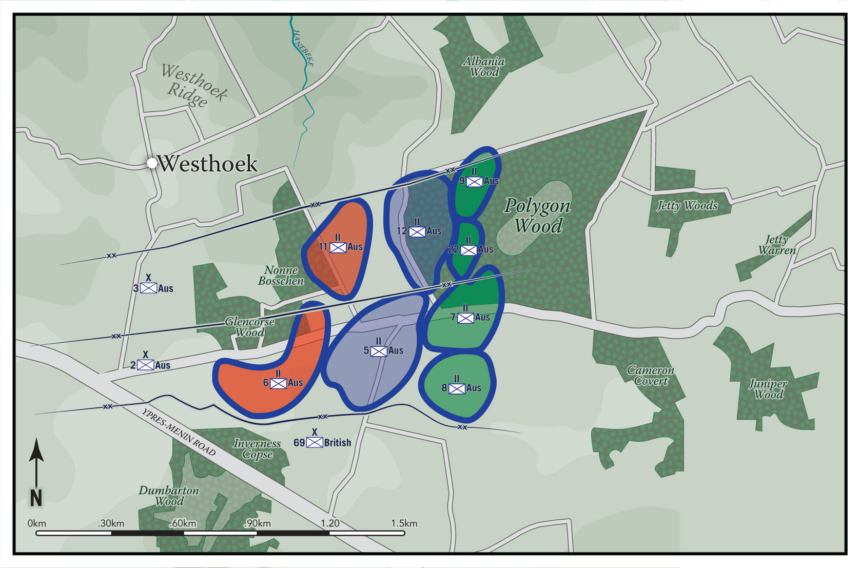 Set of 21 maps created for the book, "The Battle of Menin Road". Written by Nicholas Anderson, published by Big Sky Publishing of Sydney, Australia.