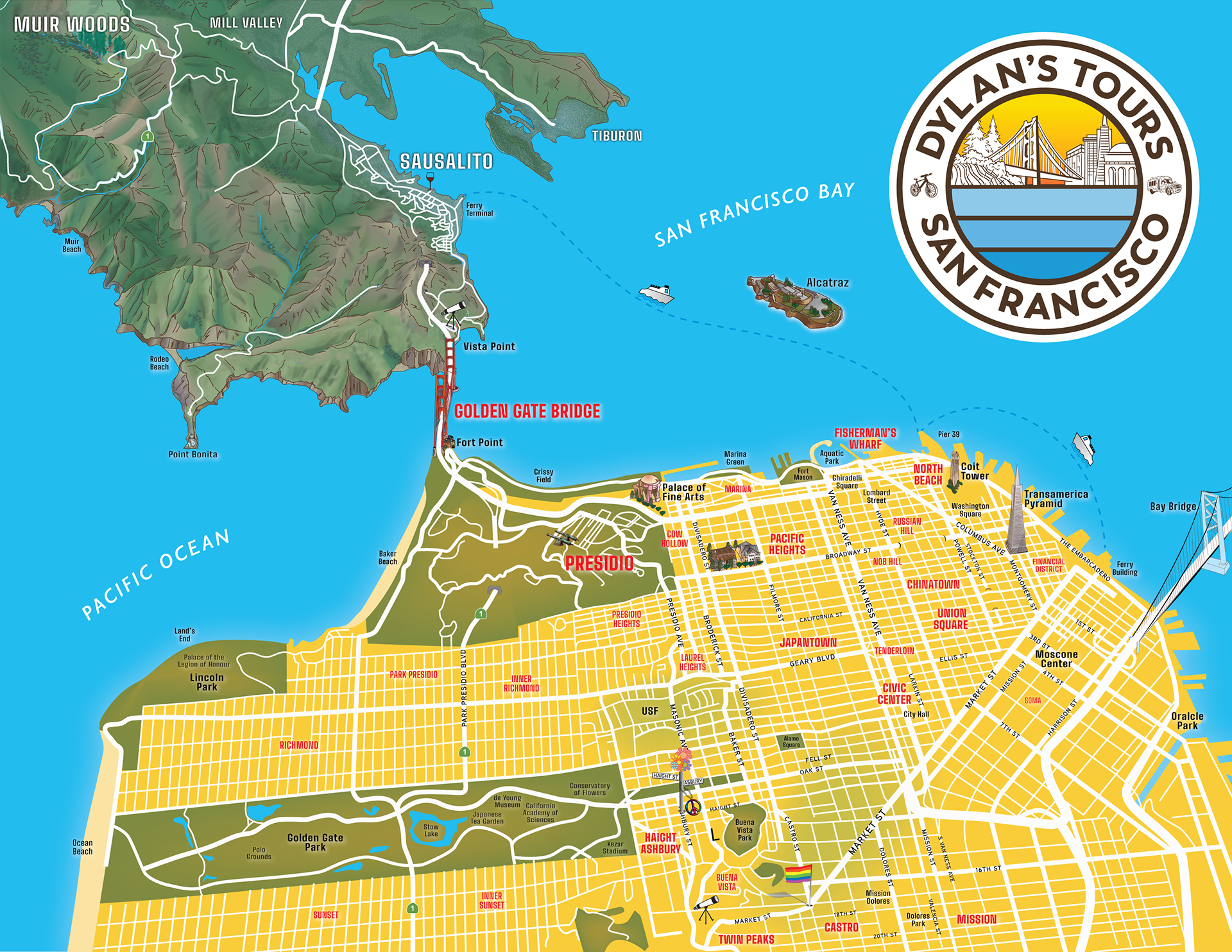 Single map of San Francisco created for well known tour operator Dylan's Tours.