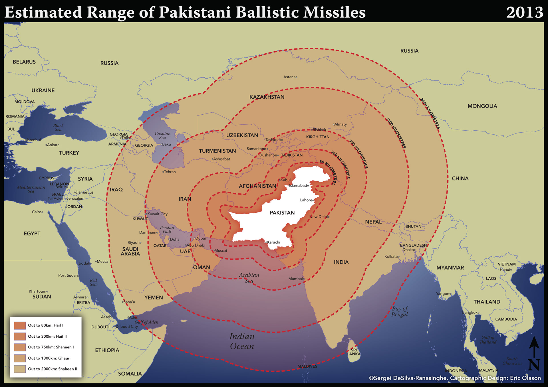 Set of 5 maps created for a private military analyst based in Australia showing the range of intercontinental ballistic missles from various countries in 2013.