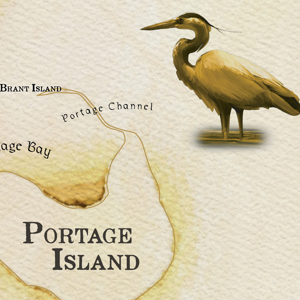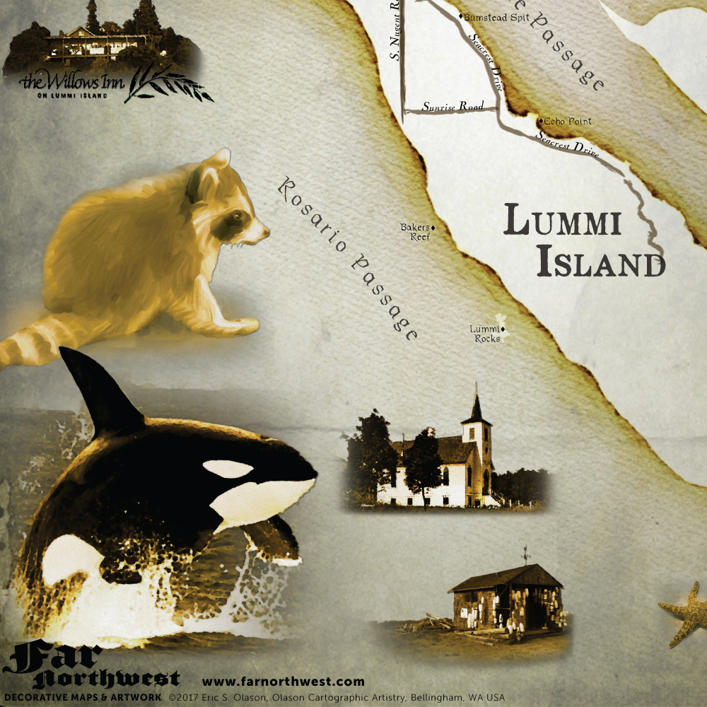 Single illustrated wall map of Lummi Island, Washington State, USA created in a worn antique style with individually rendered illustrations based on original and public domain photos, then cut and collaged onto the map.