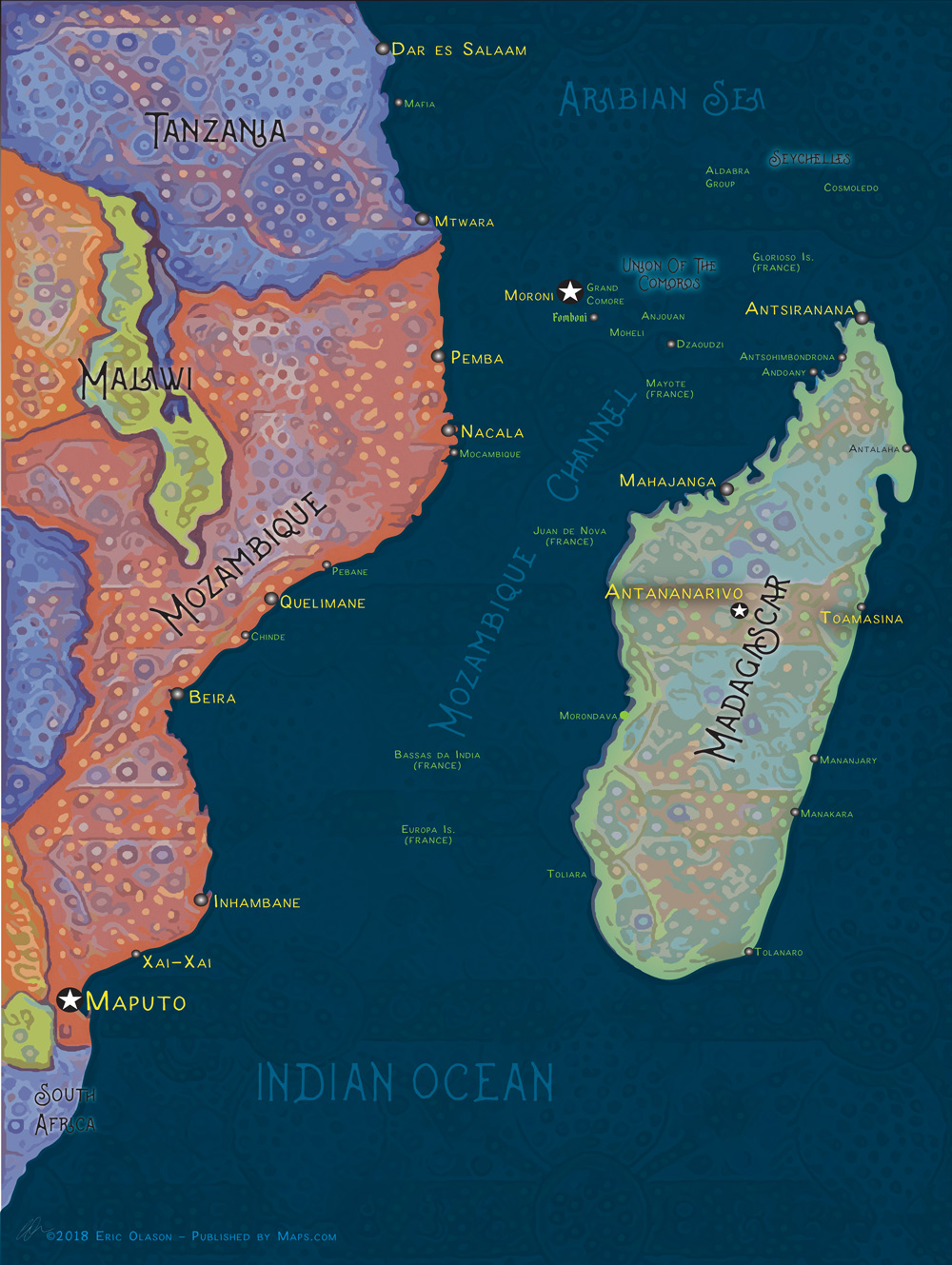 Funky map of Madagascar and the Mozambique Channel. Available for sale at www.maps.com