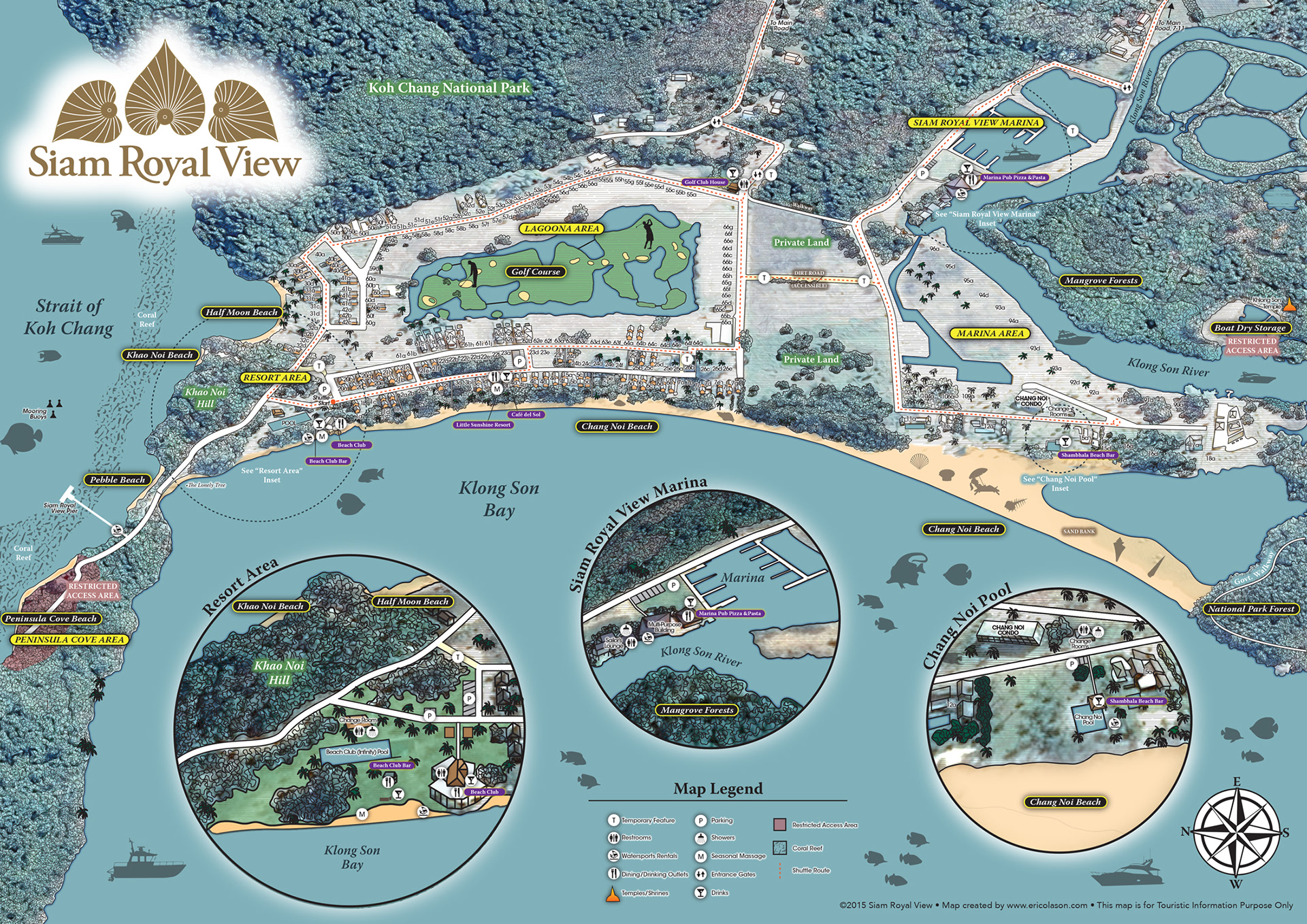 Folded brochure map created in an illustrated cartoon style showing the various guest areas of this sprawling resort located on the island of Koh Chang in Thailand.