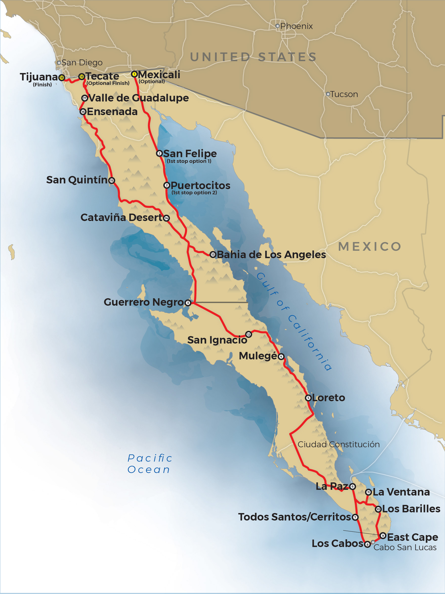 Single travel route map of the Baja California peninsula. Created for an upcoming travel guide of Baja California.